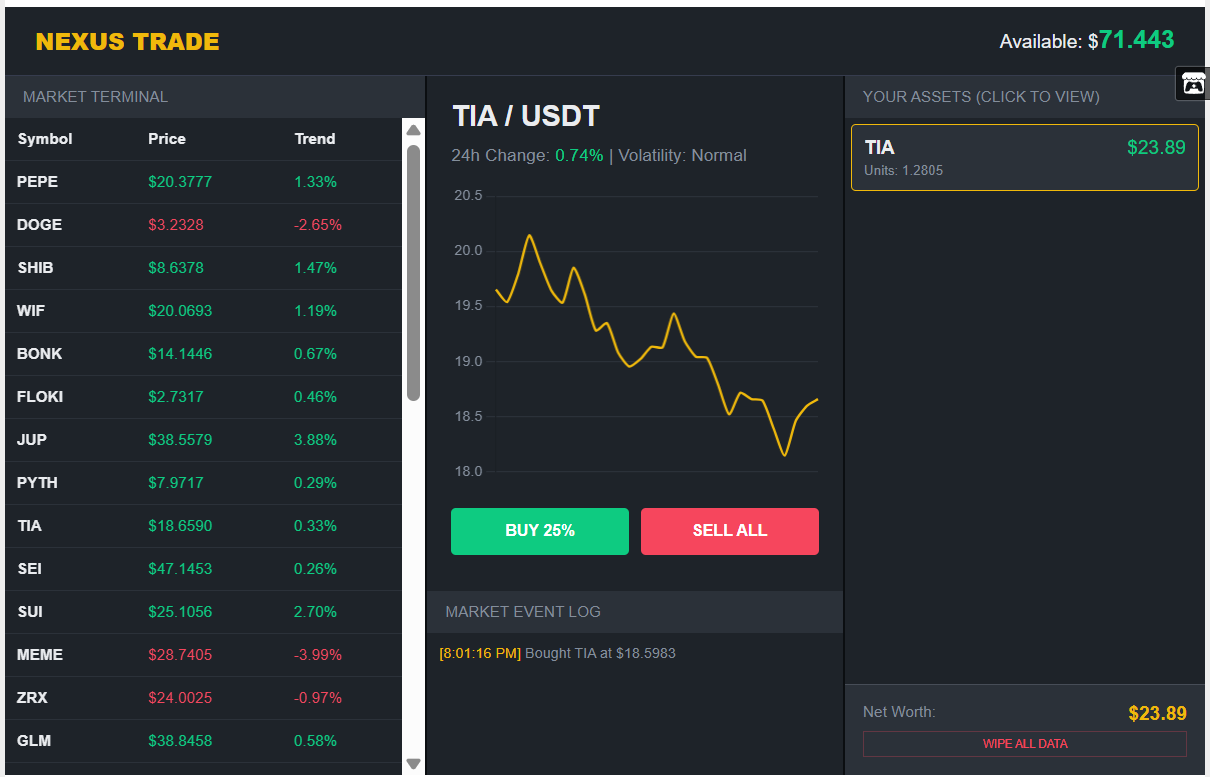 Добро пожаловать в NexusTrade — твой персональный терминал в мире цифрового хаоса и больших иксов. Это не просто игра, а полноценная имитация торговой среды, где каждое решение может превратить твои последние сто долларов в капитал кита или оставить тебя с пустыми карманами на обочине крипто-магистрали.